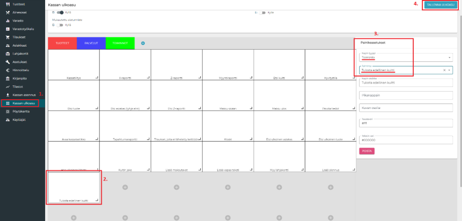 Painike edellisen kuitin tulostamiselle voidaan tehdä taustaohjelman kassan ulkoasunmuokkaustyökalulla. Valitaan kassan ulkoasujen luettelosta haluttu ulkoasu ja sen jälkeen lisätään uusi näppäin. Näppäimelle valitaan tyypiksi "Toiminto" ja toiminnoksi valitaan "Tulosta edellinen kuitti". Lopuksi painetaan "Tallenna". Kassalla muutosten käyttöönottamiseksi ulos- ja sisäänkirjautuminen riittää.