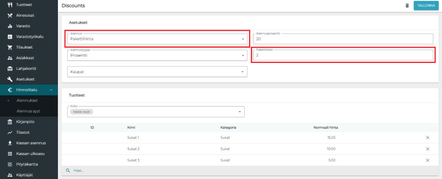Lopuksi syötetään tuotteet, joita alennus koskee. Tuotteita on mahdollista valita yksittäin tai kategorioittain. Esimerkissä on valittu kolme yksittäistä tuotetta, jotka kuitenkin kuuluvat samaan kategoriaan. Esimerkin pakettikooksi on määritelty kaksi, joten alennus annetaan, kun kaksi kolmesta alennukseen kuuluvasta tuotteesta on lisätty kuitille. Kuten muissakin kampanjatyypeissä, tässäkin voidaan valita tuotteista tietyt koot, jotka oikeuttavat alennukseen.