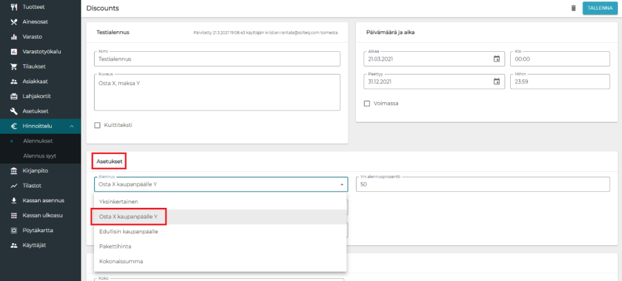 Kampanjamalli on valittavissa alennusta luodessa, taustaohjelman polussa Hinnoittelu > Alennukset. Uusi kampanja voidaan luoda painamalla "Lisää uusi". Tämän jälkeen kampanjalle syötetään perustiedot kuten muillekin kampanjoille, mutta kampanjan asetuksista alennukseksi valitaan "Osta X kaupanpäälle Y".