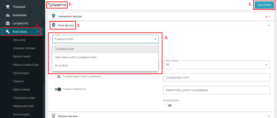 Kuitin tulostamisen vaihtoehtoja voidaan konfiguroida taustaohjelman polussa Asetukset > Haluttu työasema > Print Service. Kuitin tulostamisessa on kolme vaihtoehtoa: