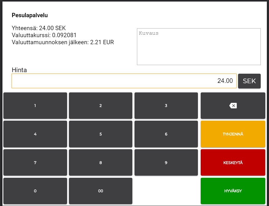 Jos työasemalle on konfiguroitu useampi valuutta, voidaan avoimen hinnan tuotteita myytäessä sekä maksu sisään / ulos -toiminnoissa vaihtaa syötettävä summa eri valuuttaan. Tällöin kuitin voi maksaa vain valitulla valuutalla.