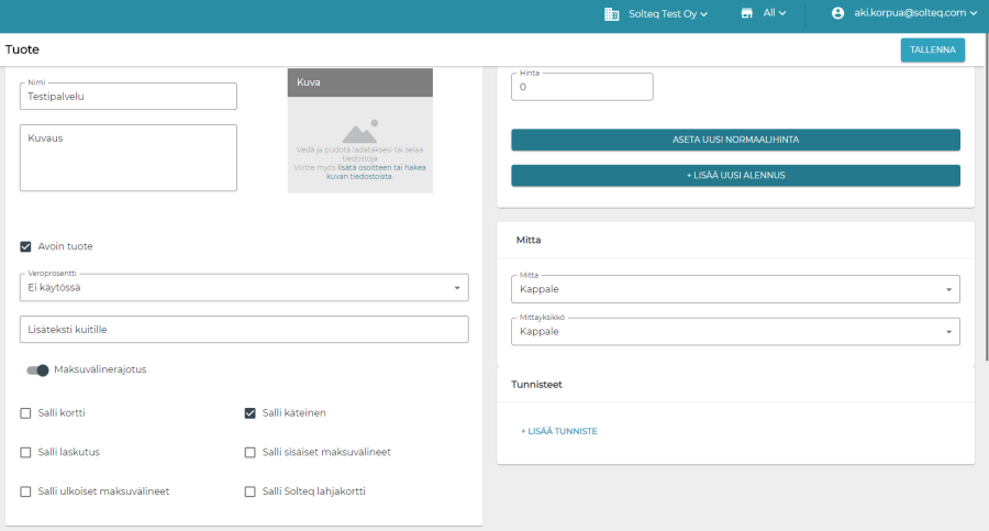 Kassajärjestelmään on lisätty maksuvälinerajoitukset tuotteille ja Maksu sisään / ulos -syykoodeille. Tuotteelle se voidaan aktivoida asettamalla "Maksuvälinerajotus"-asetus päälle. Tämän jälkeen oletuksena kaikki maksuvälinetyypit on rajattu pois käytöstä ja on erikseen päätettävä, mitkä maksuvälinetyypit sallitaan.
