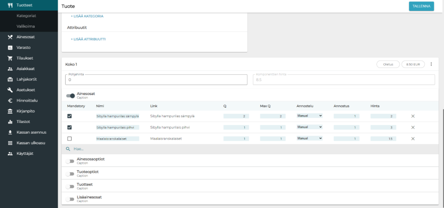 Oletuksena tuotteella on yksi koko, jonka nimi on "Normal" ja hinta 0.00. Kokoon voi lisätä ainesosia, ainesosaoptioita, tuoteoptioita, tuotteita sekä lisäainesosia. Näiden ominaisuuksien vieressä olevilla kytkimillä on tarkoitus helpottaa ylläpitoa: kun ominaisuus on tuotteella käytössä, kytkin laitetaan päälle. Tällöin nopealla vilkaisulla näkee, mitkä ominaisuudet tuotteella ovat käytössä. Ainesosaominaisuudella voidaan käyttää joko valmiiksi tehtyä annosteluryhmää tai asettaa annostelutiedot manuaalisesti valitsemalla "Annostelu"-kohtaan "Manuaalinen". Ainesosalle voi asettaa oletusmäärän (Q) ja maksimimäärän (Max Q). Ainesosat voidaan määritellä kokoon pakollisiksi tai muokattaviksi myytäessä lisättäviksi. Pakollisten ainesosien ominaisuuksia ei voi muuttaa. Muokattaviksi määriteltyjen tuotteiden määrää voidaan muokata kassalla. Yllä olevan kuvan määrittelyt näkyvät kassaohjelmassa seuraavasti: Ainesosaoptiot ovat kassalla valittavissa tuotetta myytäessä. Ainesosaoptiot voivat olla joko pakollisia tai valinnaisia ja optioiden sisällä voidaan valita oletusvaihtoehto. Esimerkiksi pizzaa myytäessä pohja voisi olla pakollinen, mutta juusto ei: