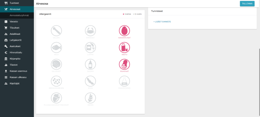 Aiemman Excel-tuontimenetelmän sijaan ainesosia voidaan nyt lisätä taustalta. Tämä tapahtuu valitsemalla Ainesosat > Lisää uusi. Perustiedot (mukaan lukien ainesosan kuva), kategoriat, hintatiedot sekä mittatiedot toimivat samalla tavalla kuin varastotuotteissa. Ainesosaa muokattaessa voidaan valita, mitä allergeeneja ainesosa sisältää. Punainen tarkoittaa, että ainesosa sisältää allergeenia.