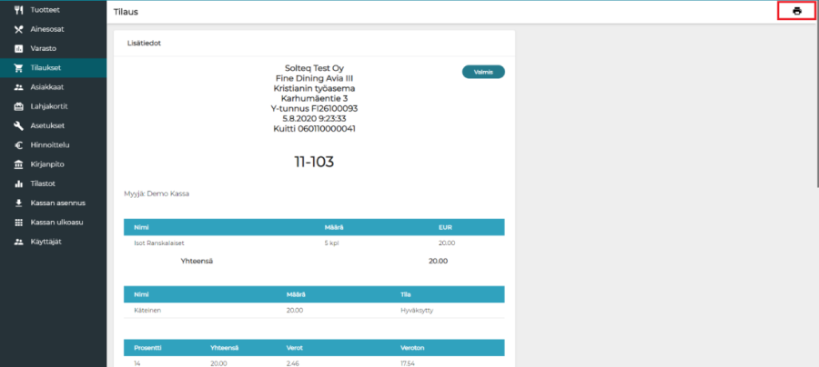 Kuittikopio voidaan nyt tulostaa taustalta. Kun on avattu haluttu kuitti, valitaan tulostimen kuva oikeasta yläkulmasta: