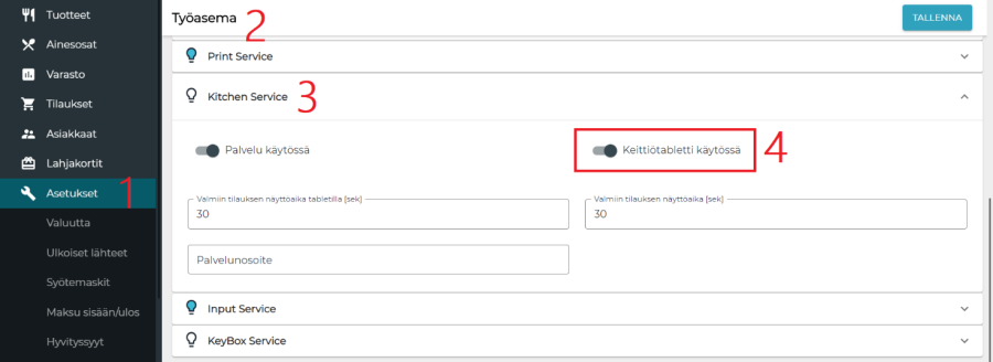 käyttöön taustapalvelusta: Asetukset > Haluttu työasema > Kitchen Service > Keittiötabletti käytössä -kytkin.