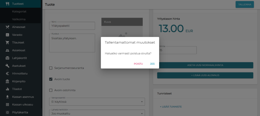 Mikäli käyttäjä yrittää poistua esimerkiksi tuotteen luonnista, muokkauksesta tai työaseman asetusten