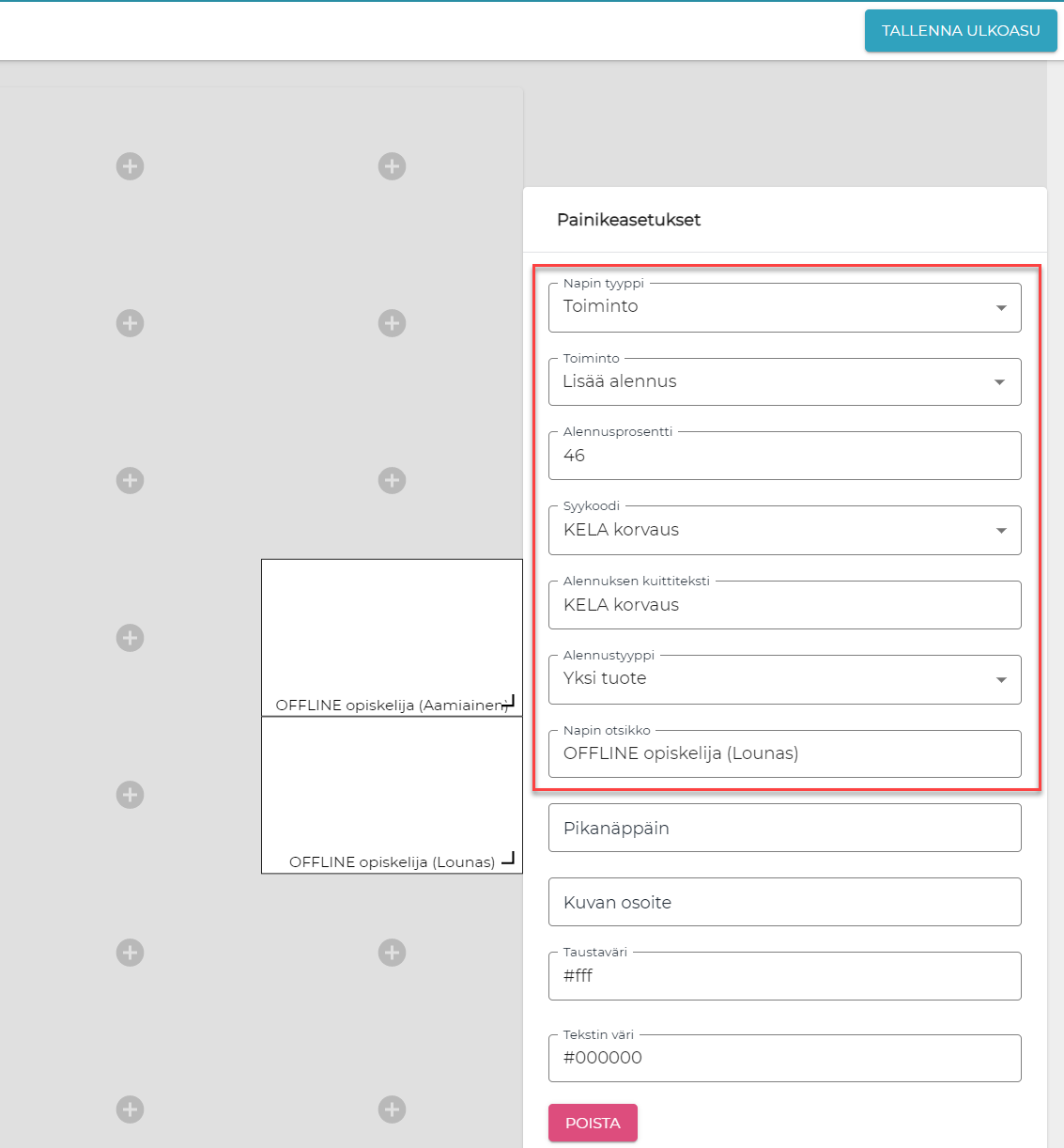 Luo uusi Lisää alennus- painike kassaan; sen avulla myyjät voivat antaa alennuksen manuaalisesti, jos työasema on offline-tilassa, ja opiskelijan oikeutusta ateriaetuun ei voida tarkistaa kassalla. lTämä antaa myös mahdollisuuden eritellä kyseiset maksut raporteissa.