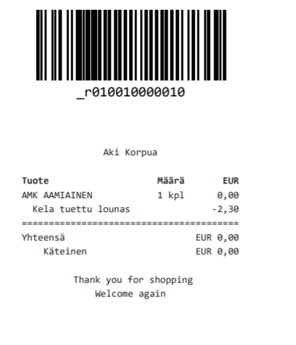 Kun opiskelijan KELA- tai ajokortti luetaan viivakoodin lukijalla ja hänelle on oikeus etuuksiin, näyttää kassan ostokori allaolevan esimerkin mukaiselta.