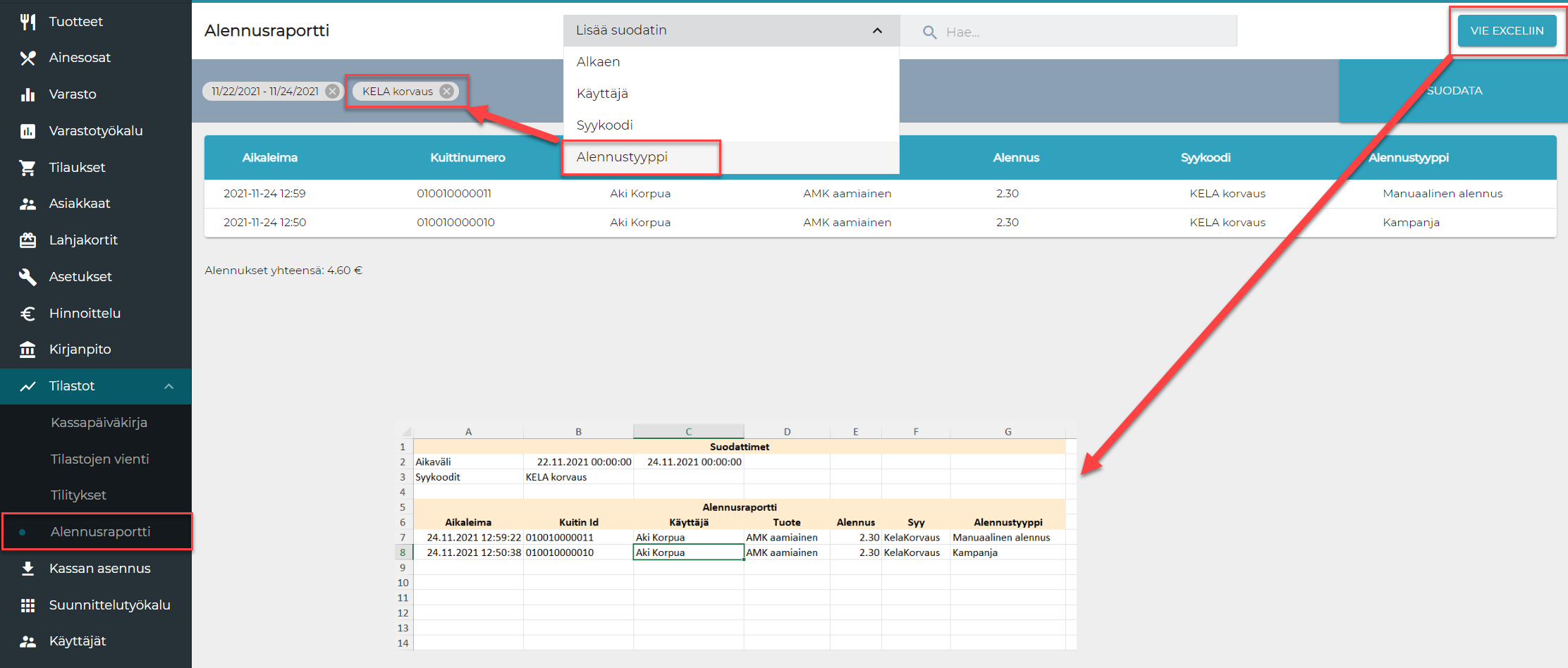 Varsinainen raportointi KELA-tuetuista aterioista saadaan alennusraportilta.