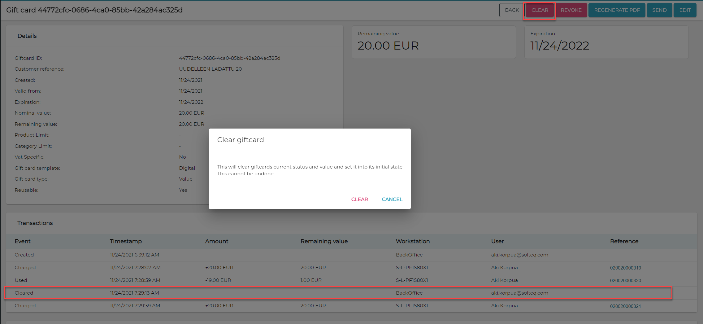 Esipainettuja lahjakortteja voidaan myös nollata, jolloin ne voidaan laittaa uudelleen käyttöön ja ladata kassalla