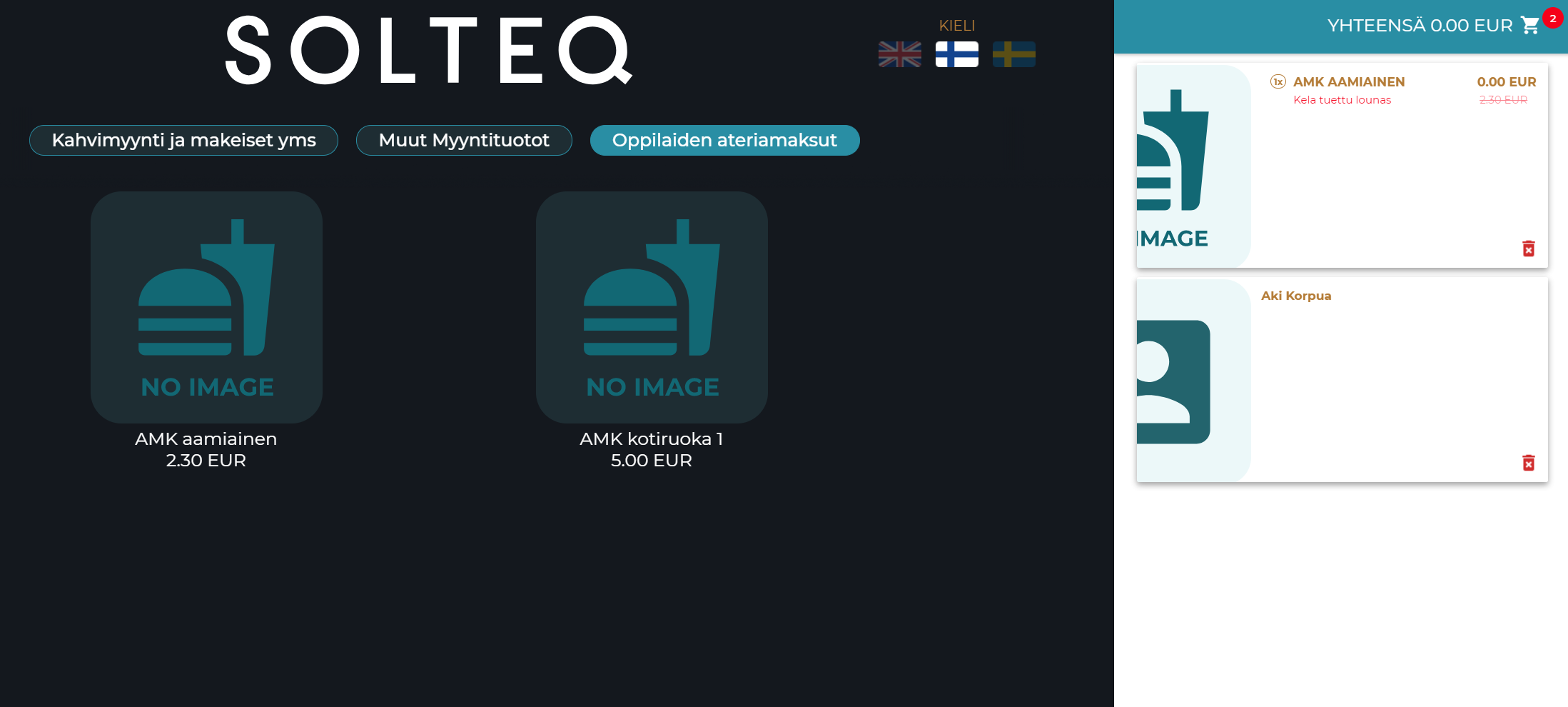 Luo tarvittavat ateriatuotteet esim. AMK Aamiainen 2.30€ ja AMK Lounas 5.00€